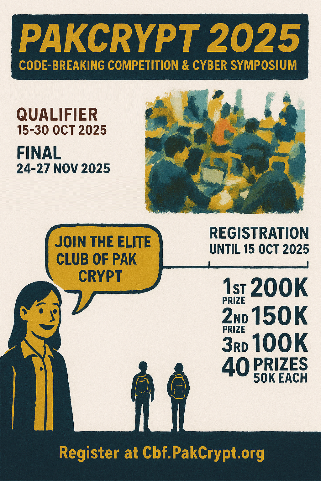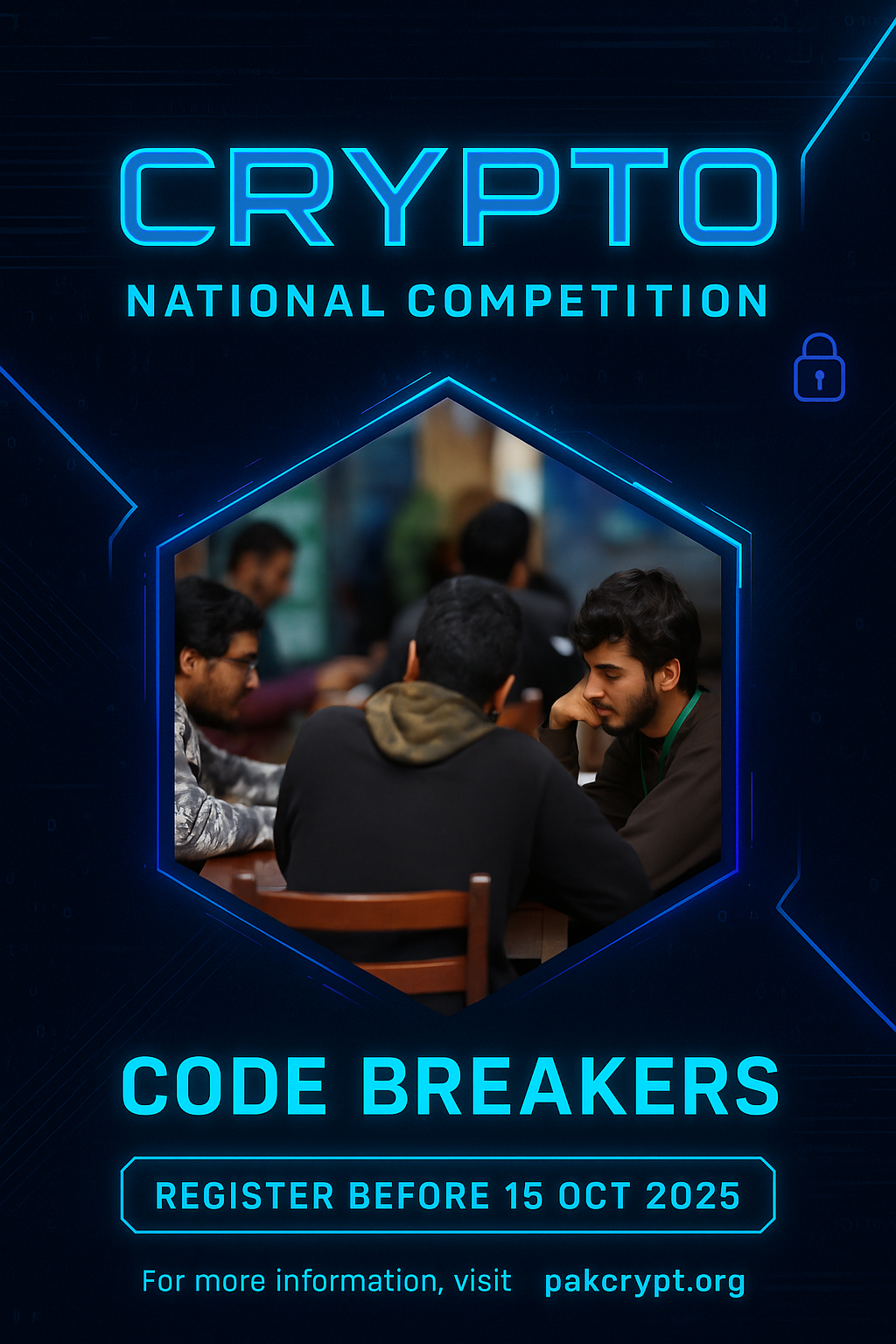 The final round of PakCrypt 2025 will be held on campus at NCCS, Air University, Islamabad in Nov 2025. The top teams from the previous rounds will compete for the prize and prestige.